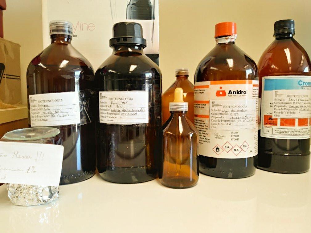 Para preparar o fixador, antes teríamos que preparar as soluções faltantes para sua composição, sendo assim, a turma foi dividida em três grupos, cada grupo tinha a responsabilidade de preparar uma solução:
