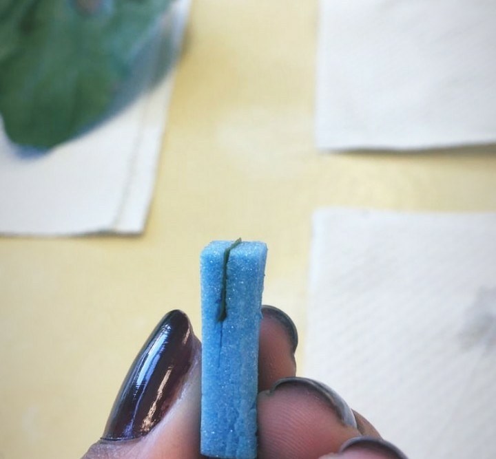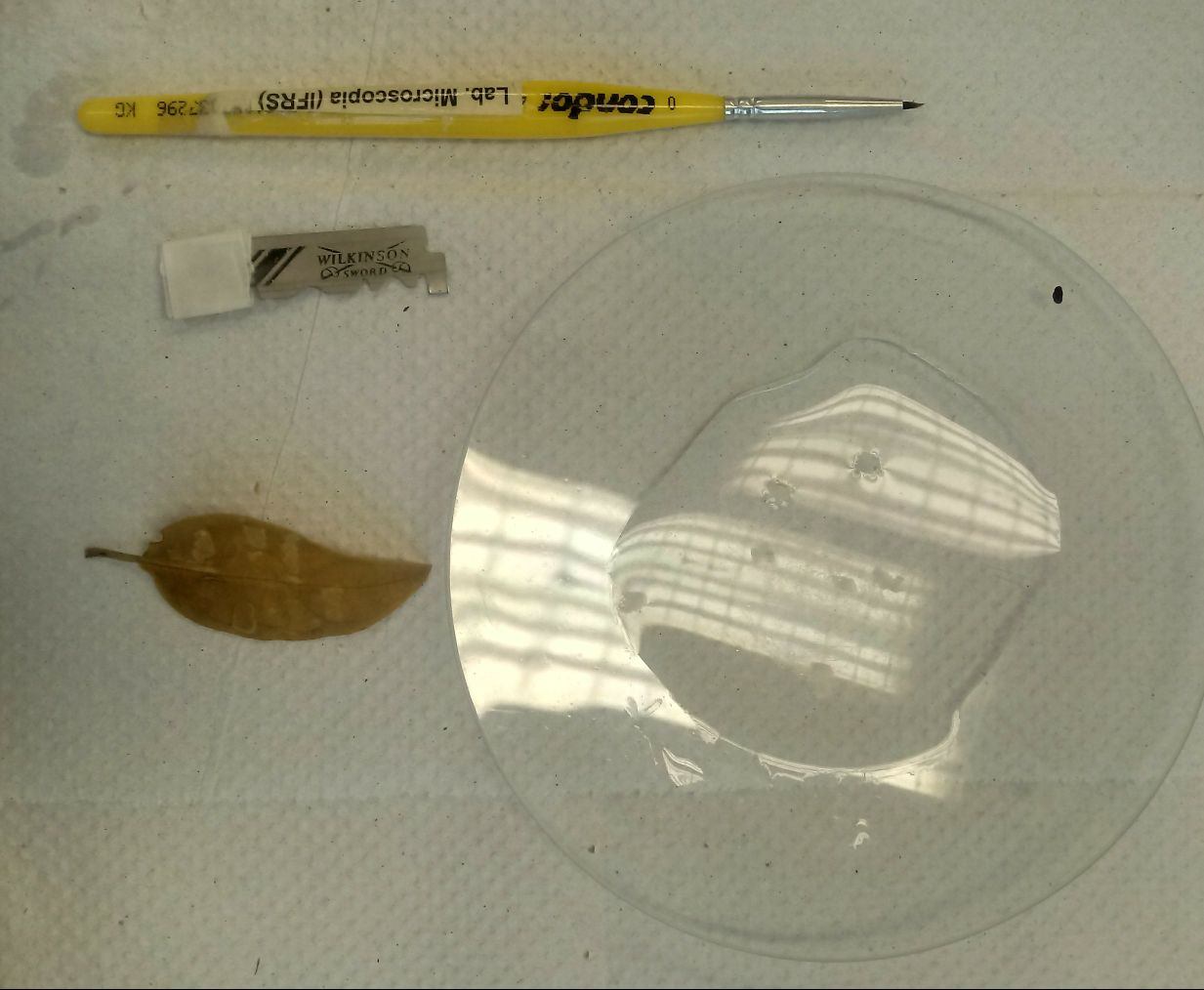 O próximo passo, é passar a lamina de aço bem de leve na parte onde fica posicionada a superfície transversal da folha visando adquirir amostras mais finas possíveis.