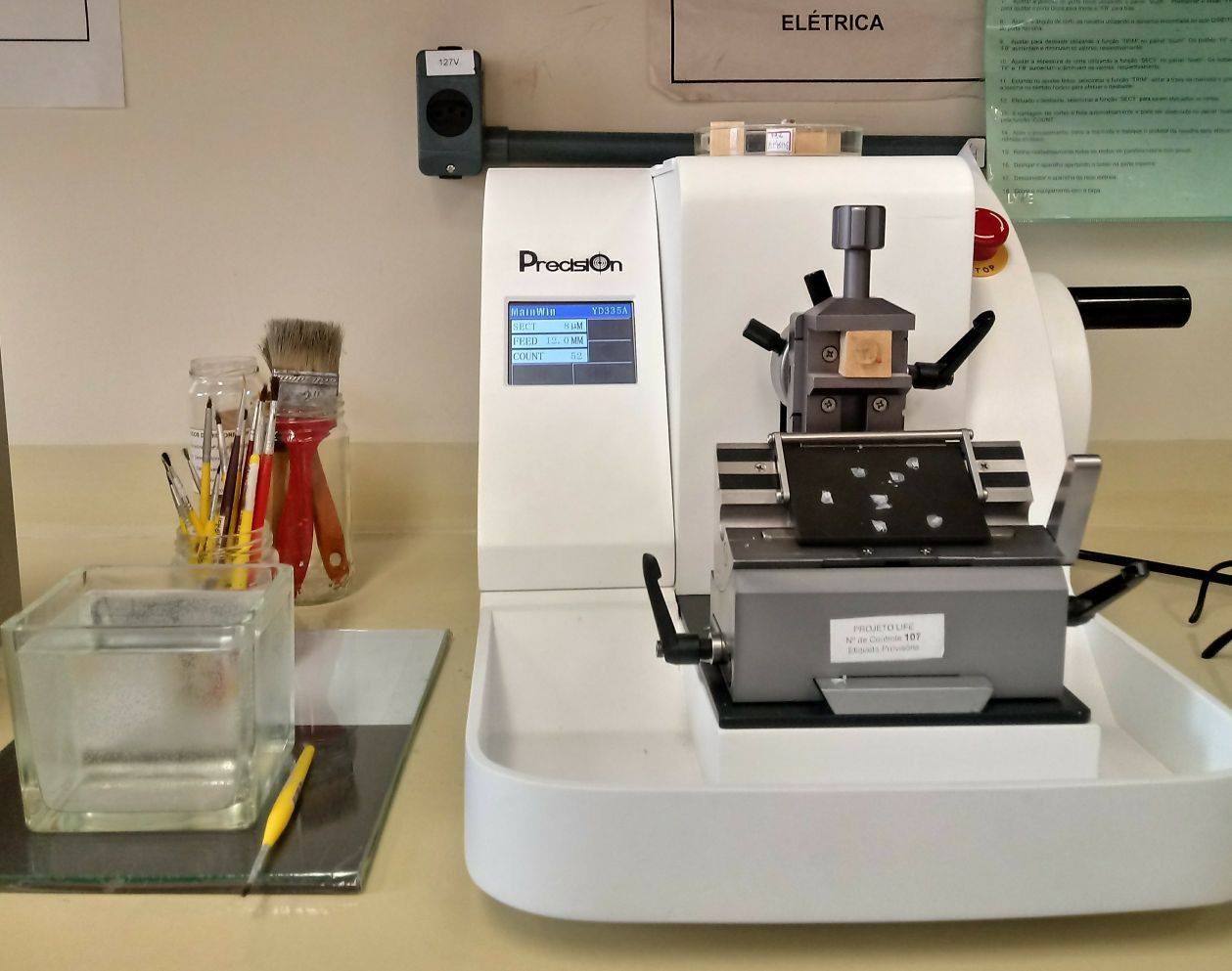O micrótomo é um equipamento essencial para montagem de lâminas permanentes pois permite o secionamento da amostras na espessura de alguns micrômetros. (LAVEG-UFSC. 2014)