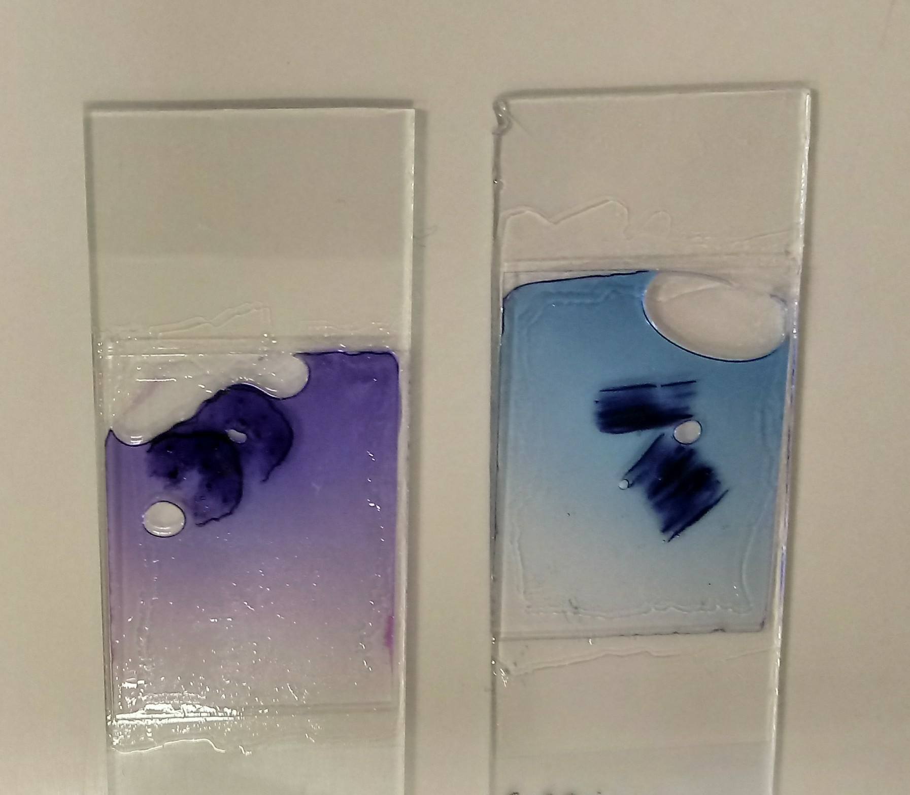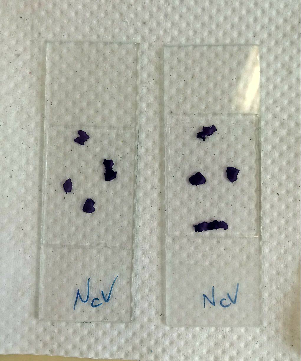 Em uma cubeta, a amostra foi mergulhada em azul de toluidina por 2 minutos e em seguida lavada com água da torneira. Em outra cubeta, desta vez com o corante fúcsia, a amostra foi deixada por 10 segundos e lavada novamente com água da torneira.