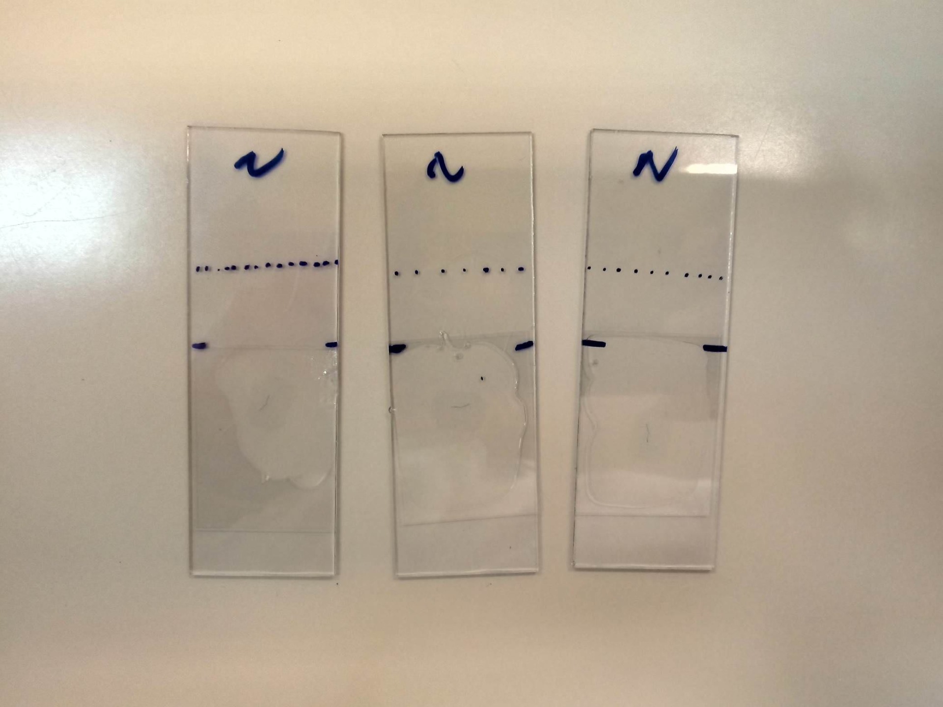 Seccionamos a amostra em torno de 10 micrômetros, depositando os melhores cortes em água morna para que o material *se esticasse* e com o auxílio de um pincel, depositamos a amostra na lâmina, deixando-a secar em cima de uma placa aquecedora.